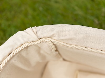 De binnenbekleding: matras, kussen en deken zijn van ongebleekte katoen gemaakt. Het matras is gevuld met hooi en het hoofdkussen met houtschilfers.