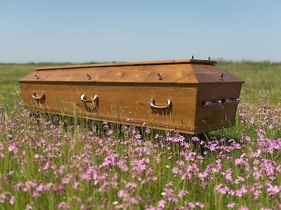 Deze kist is van massief eikenhout gemaakt. De kist is donker gebeitst en heeft een kapdeksel met een luikje. Het luikje sluit door middel van 2 oudkoperen knoppen. De deksel sluit door middel van 8 knoppen van oudkoper.